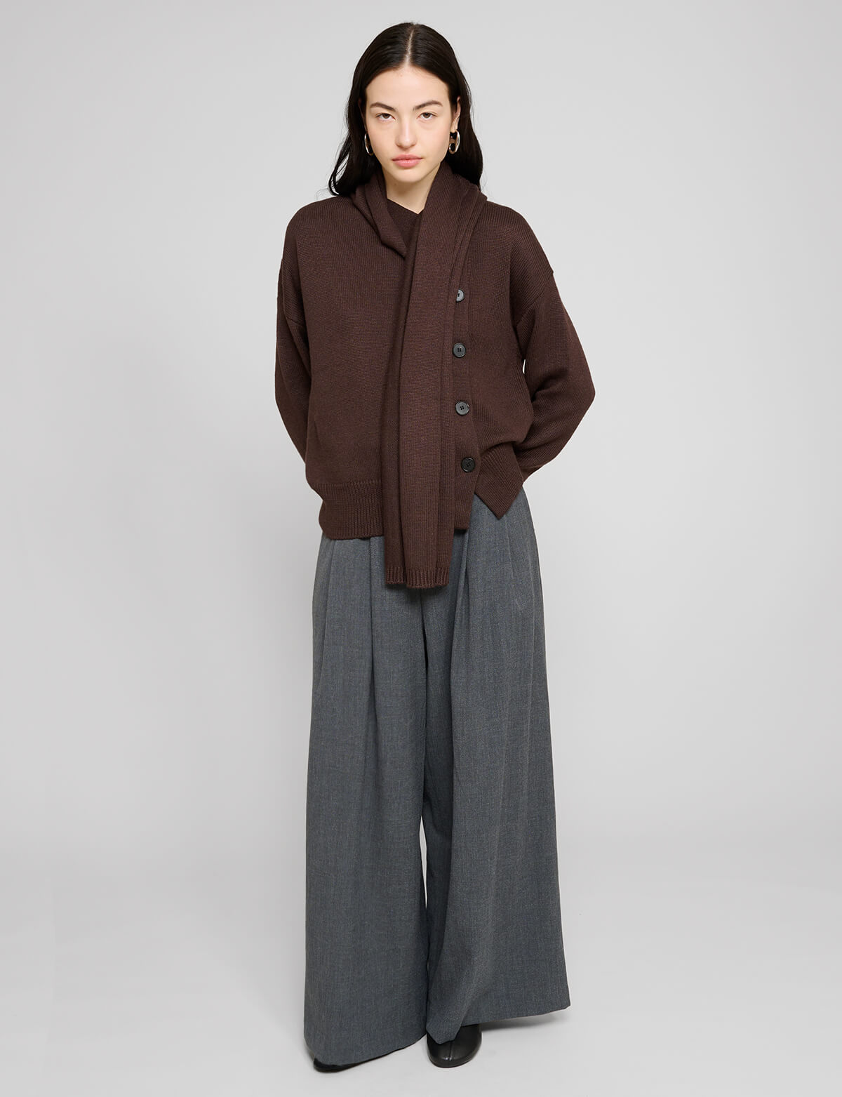 Chocolate brown asymmetric button sweater with attached wrap-around scarf.