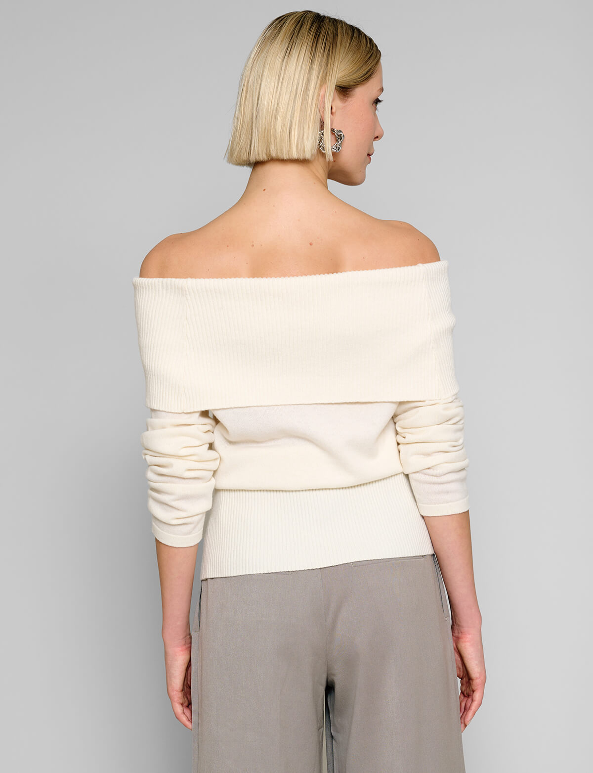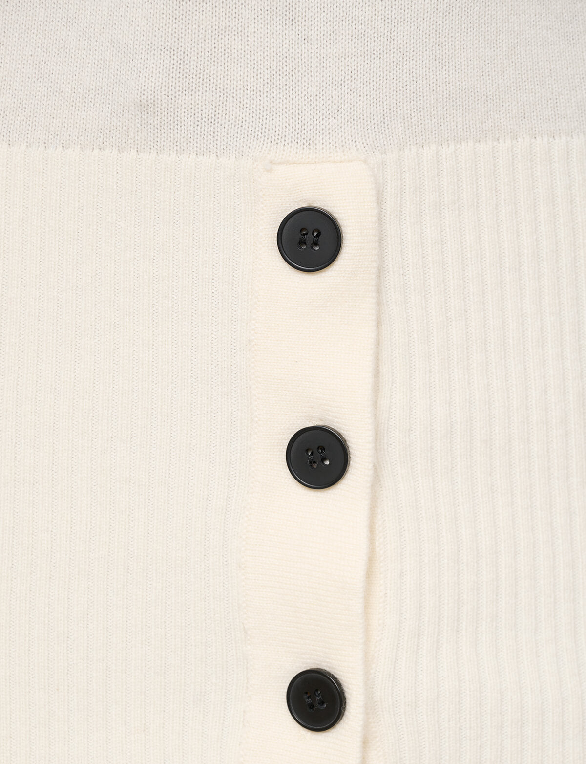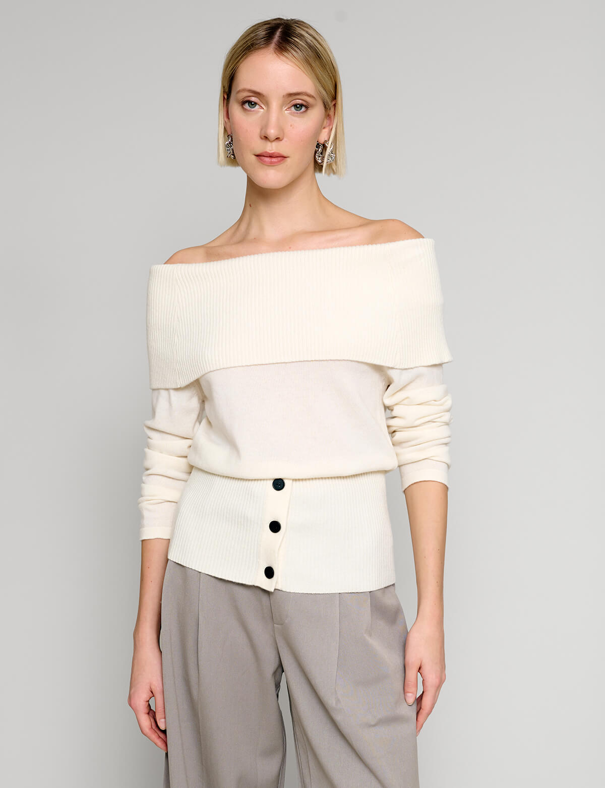 Off-white knit off-the-shoulder knit top with contrast button waistband.