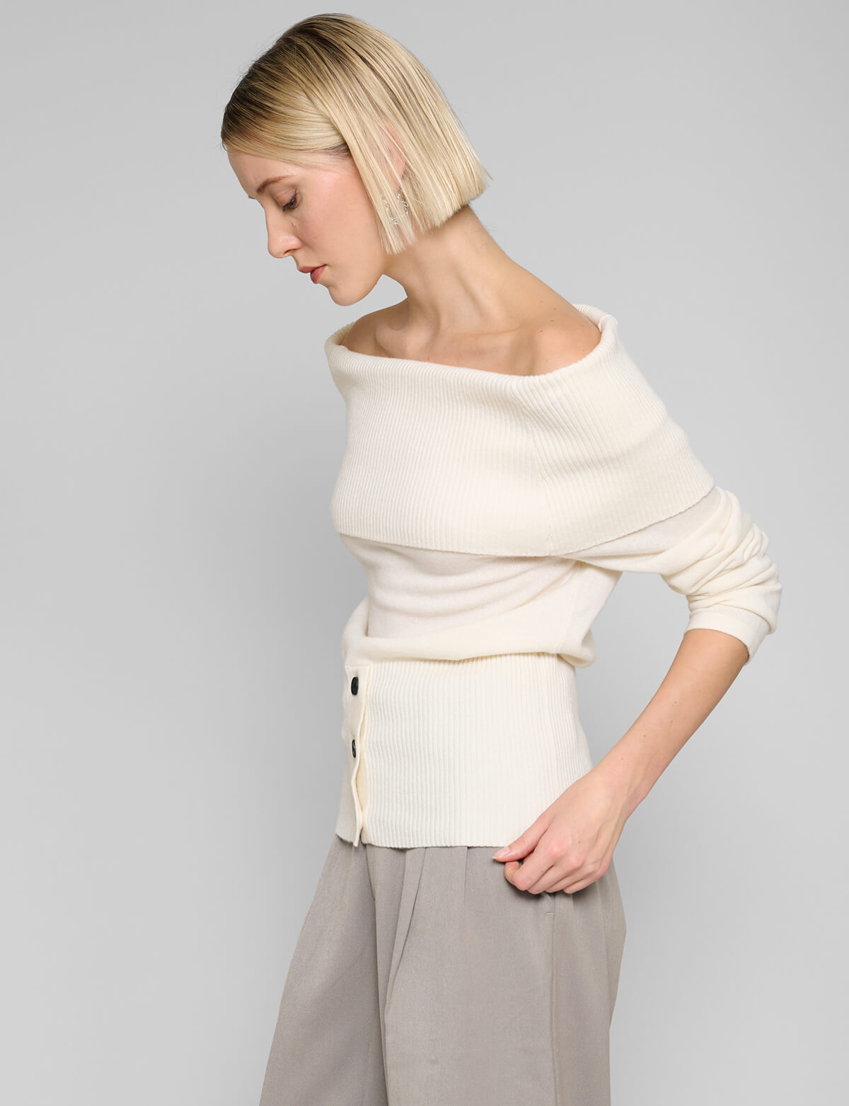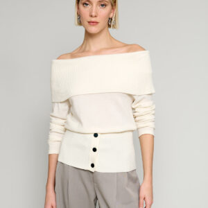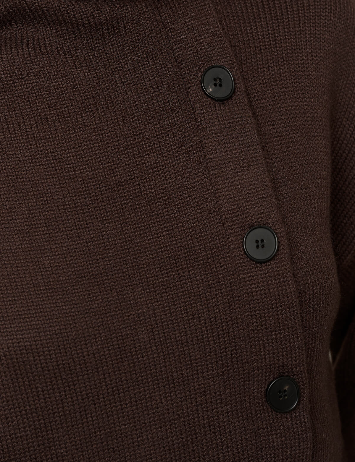 Chocolate brown asymmetric button sweater with attached wrap-around scarf.