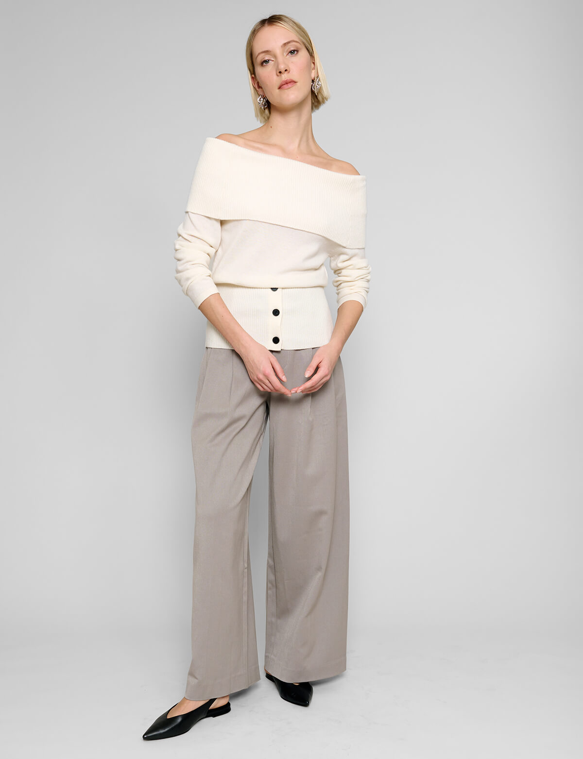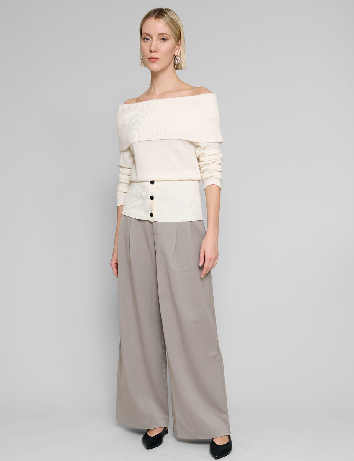Off-white knit off-the-shoulder knit top with contrast button waistband.