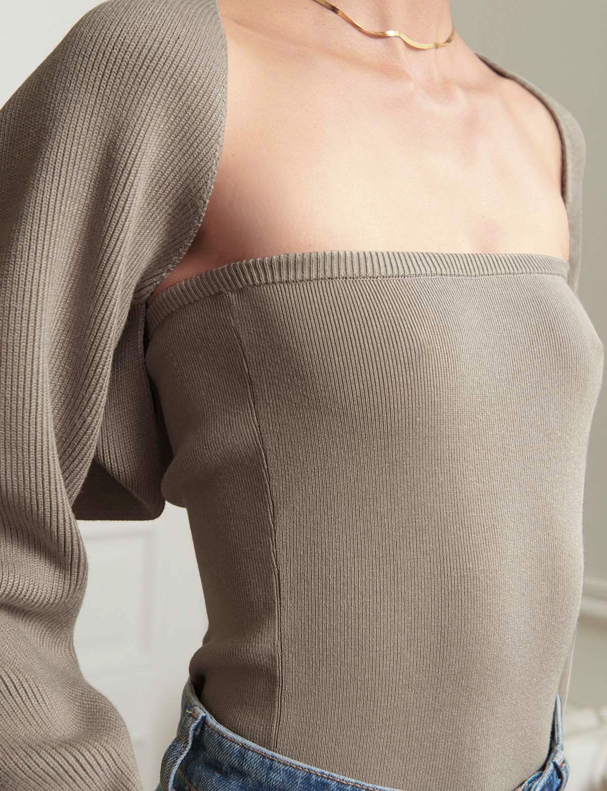 Soft strapless knit top with detachable knit bolero in pebble color . Wear it together or separately .